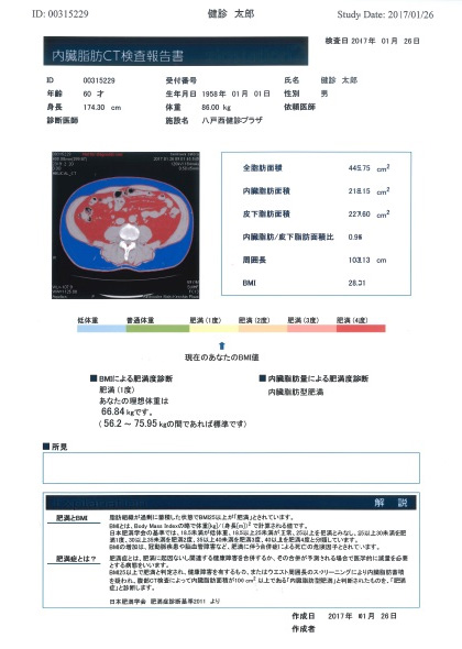 下図のCT画像で、赤い範囲が内臓脂肪、青い範囲が皮下脂肪を表します。お手元には下図のような測定結果が届きます。